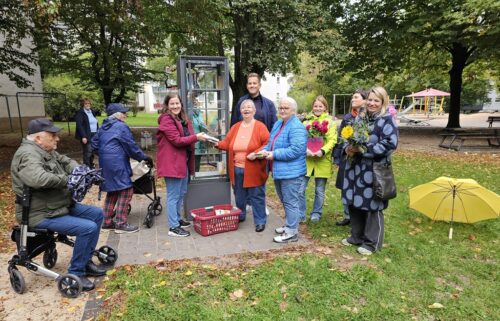 Am vergangenen Donnerstag, 25. September 2025, war es also soweit und der Bücherschrank konnte erstmals und mit einer kleinen Feier bestückt und in Betrieb genommen werden. Bücherschrank-Patin Claudia Peters und ihre Mitstreiterinnen Maria Winter und Anita Odorfer vom „Caféstündchen“, Carl-Sonnenschein-Straße 72, waren bei dem Zeremoniell dabei, ebenso Susanne Serke und Michael Schneider vom Ortsbeirat 6, Bettina Boknecht vom Stadtplanungsamt und von „Sozialer Zusammenhalt Sossenheim“ Gwendolin Schwab sowie weitere offizielle Vertreter und Anwohner.