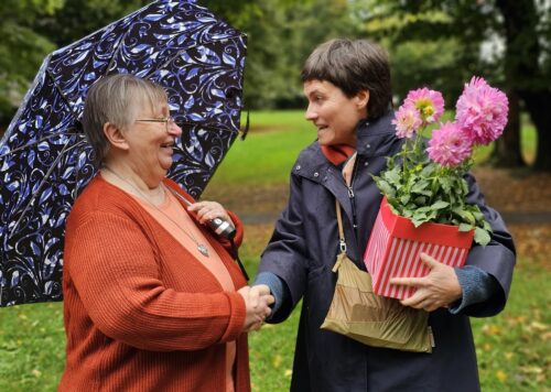 Die Laudatio hielt Susanne Serke. Insbesondere bedankte sie sich für das ehrenamtliche Engagement von Claudia Peters und ihren Helferinnen, wie das anschließend auch Bettina Boknecht tat und Claudia Peters einen Blumentopf übergab. Anschießend noch ein kleiner Umtrunk im nahegelegenen Büro von „Caféstündchen“, Carl-Sonnenschein-Straße 72, mit belegten Brötchen, rundete den festlichen Nachmittag ab.