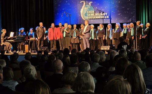 Bericht mit Video. Es war ein tolles Jubiläums-Konzert am vergangenen Sonntag, 28. September 2025, im großen Saal des Volkshauses Sossenheim. Unterstützt vom Kultur- und Förderkreis, der sich um das „Periphere“ kümmerte, hatten der Frauenchor und die Mainzer Hofsänger ein Programm aus Musik ganz unterschiedlicher Genres zusammengestellt, das viel Applaus und am Ende auch stehende Ovationen bekam. Vereinsvorsitzende und Sängerin Gundula Schmitt bedankte sich zunächst beim Kufö-Vorsitzenden Franz Kissel, „der uns ganz charmant angesagt hat!“