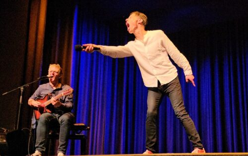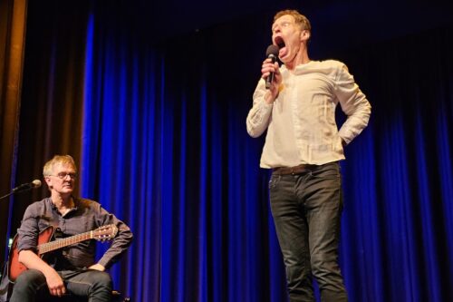 Auch nach der Pause startete Maddin mit Gesang und Solotanz. Seine einzigartige Mimik war mit tonangebend, und er bezog sogleich wieder das Publikum mit ein, insbesondere auch Roland und Michael (die ärmsten). Wenn er die Wohnung verlasse, habe er Angst vor einem „Worschtkäs“ oder auch vor „Putkäs“ und einer „Wagner-Gruppe mit E-Bikes“. Alles zusammen war es ein tolles Programm, dem Maddin noch einen „Schöne Sonndaach“ und eine Zugabe anfügte.