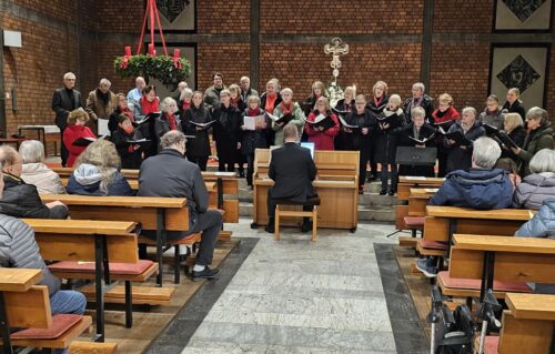 Die kath. Kirche St. Michael bot eine „Musikalische Einstimmung in den Advent“ und gestaltete ab 17 Uhr in der gut besuchten Kirche ein Adventskonzert mit seinem „Vokalensemble“ und mit dem „Frauenchor der Chorgemeinschaft 1880/82“, Moderation: Stefan Abel. Nach dem Konzert füllte sich der Weihnachtsmarkt nochmals, und wie man sehen konnte, musste weiterer Glühwein warm gemacht werden.