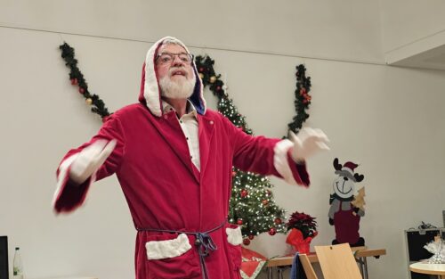 Der Nikolaus kam rein. Er hielt eine emotionale Ansprache und sprach auch deutliche Worte zu den Kriegsverbrechen im Osten von Europa und im Nahen Osten. Und fügte abschließend mahnend hinzu: „Gegen Hass muss man Liebe setzen!“ Roger Podstatny dankte dem Nikolaus, dargestellt von Manfred Menningen.