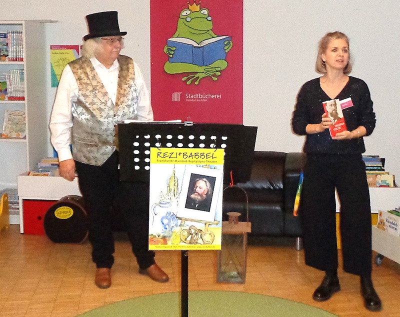Mario Gesiarz ist vor allem im Frankfurter Westen kein Unbekannter. Als Initiator des Frankfurter Mundart-Rezitations-Theaters „Rezibabbel“ bringt er seit mehr als zwei Jahrzehnten, den Frankfurtern wie den „Eigeplackte“, vor allem die Werke des Mundartdichters und Satirikers Friedrich Stoltze (1816-1891) nahe. Die humorigen Stoltze-Gedichte sorgen schon aus Tradition immer wieder für Stimmung. Die Besucherinnen und Besucher des Sossenheimer Bücherwurms waren sich auch diesmal wieder einig, dass kaum jemand so treffend wie Mario Gesiarz die Werke Stoltzes vorzutragen weiß. Wenn er den zeitgenössischen Zylinder aufsetzt, nimmt er sein Publikum rasch mit ins Frankfurt des 19. Jahrhunderts, was nicht selten selbst die Gäste zum Schmunzeln bringt, die des Frankfodderischen nicht mächtig sind.