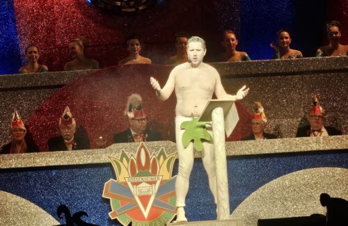 Noch verdeckt wurde eine Statue auf die Bühne geschoben. Darunter A-donis oder B-donis, oder eine griechische Gestalt? Diese Fragen wollte Robert Forler, neues Mitglied der SPRITZER, mit seinem Redebeitrag klären. Das gelang (bewusst?) nicht ganz, sorgte im Saal aber für Lachsalben mit Bravo-Rufen. Ein sehr guter Einstieg bei den SPRITZER, für den es viel Applaus und das dreifach Sossenheim HELAU gab.